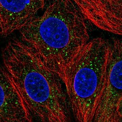 - Immunofluorescent staining of human cell line MCF7 shows localization to cytosol & vesicles.
