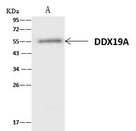 - DDX19A was immunoprecipitated using: Lane A: 0.5 mg HepG2 Whole Cell Lysate. 4 uL anti-DDX19A rabbit polyclonal antibody and 60 ug of Immunomagnetic beads Protein A/G. Primary antibody: Anti-DDX19A rabbit polyclonal antibody, at 1:100 dilution. Secondary antibody: Clean-Blot IP Detection Reagent (HRP) at 1:1000 dilution. Developed using the ECL technique. Performed under reducing conditions. Predicted band size: 54 kDa. Observed band size: 55 kDa.