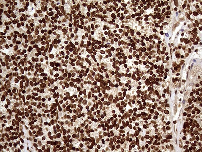 - Immunohistochemical staining of paraffin-embedded human lymph node tissue within the normal limits using anti-DDX19A mouse monoclonal antibody. (Heat-induced epitope retrieval by 1mM EDTA in 10mM Tris buffer (pH8.5) at 120°C for 3 min, TA809971)(1:500).