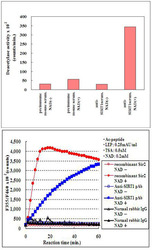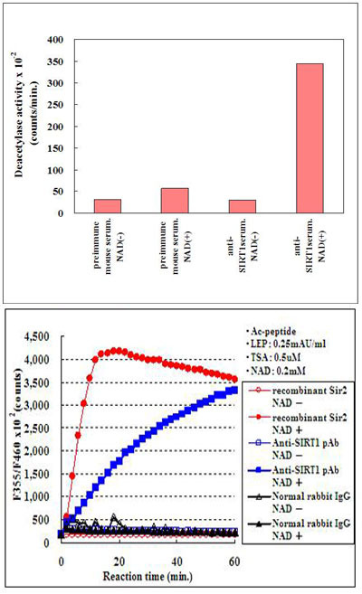 - Measurement of 293T cell endogenous SIRT1 activity in an immunoprecipitate using SIRT1 polyclonal antibody (Cat # PAB0004) by means of SIRT1/Sir2 Deacetylase Fluorometric (Human) Assay Kit (Cat # KA0105).
