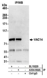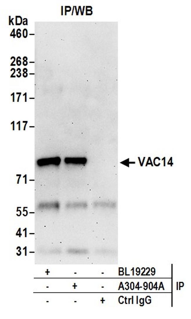 - Detection of human VAC14 by western blot of immunoprecipitates. Samples: Whole cell lysate (0.5 or 1.0 mg per IP reaction; 20% of IP loaded) from HeLa cells prepared using NETN lysis buffer. Antibodies: Affinity purified rabbit anti-VAC14 antibody A304-904A (lot A304-904A-1) used for IP at 6 µg per reaction. VAC14 was also immunoprecipitated by rabbit anti-VAC14 antibody BL19229. For blotting immunoprecipitated VAC14, A304-904A was used at 0.4 µg/ml. Detection: Chemiluminescence with an exposure time of 3 minutes.