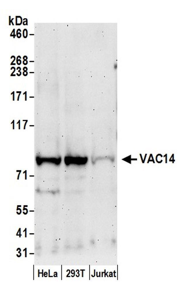 - Detection of human VAC14 by western blot. Samples: Whole cell lysate (50 µg) from HeLa, 293T, and Jurkat cells prepared using NETN lysis buffer. Antibody: Affinity purified rabbit anti-VAC14 antibody A304-904A (lot A304-904A-1) used for WB at 0.1 µg/ml. Detection: Chemiluminescence with an exposure time of 3 minutes.