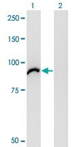 - Western Blot analysis of VAC14 expression in transfected 293T cell line by VAC14 monoclonal antibody (M03), clone 3B2.Lane 1: VAC14 transfected lysate (Predicted MW: 88 KDa).Lane 2: Non-transfected lysate.
