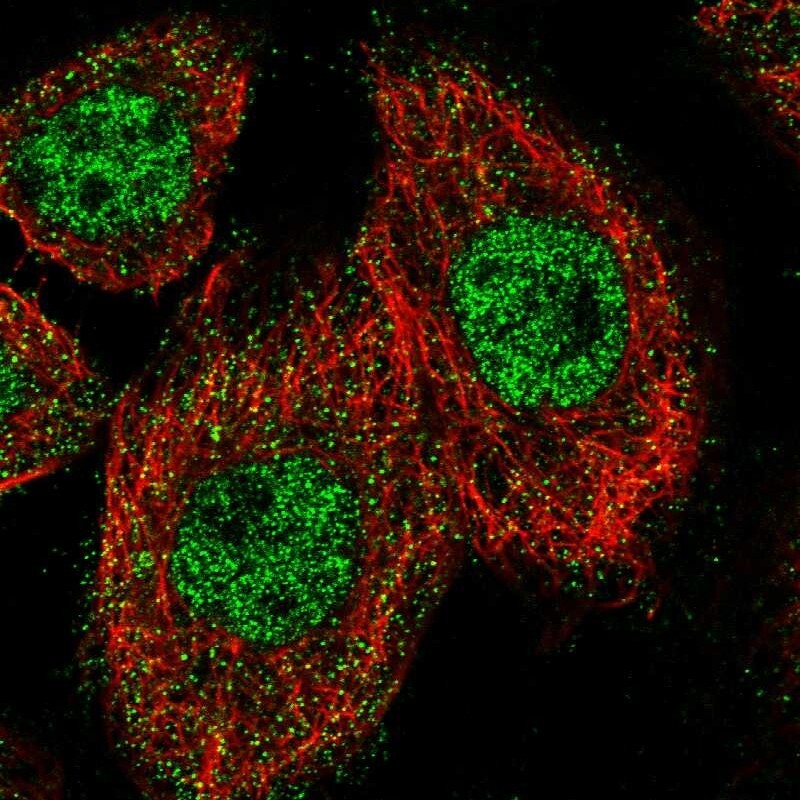- Immunofluorescent staining of human cell line A-431 shows localization to nucleoplasm & cytosol.