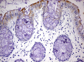 - Immunohistochemical staining of paraffin-embedded Human colon tissue within the normal limits using anti-KRT24 mouse monoclonal antibody. (Heat-induced epitope retrieval by 10mM citric buffer, pH6.0, 120C for 3min, TA802897)