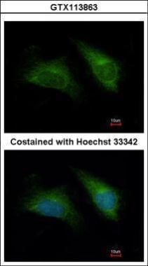 - Immunofluorescence analysis of methanol-fixed HeLa, using DAP3(GTX113863) antibody at 1:200 dilution.
