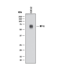 - Detection of Mouse B7-1/CD80 by Western Blot. Western blot shows lysates of C2C12 mouse myoblast cell line. PVDF membrane was probed with 1 µg/mL of Goat Anti-Mouse B7-1/CD80 Antigen Affinity-purified Polyclonal Antibody (Catalog # AF740) followed by HRP-conjugated Anti-Goat IgG Secondary Antibody (Catalog # HAF017). A specific band was detected for B7-1/CD80 at approximately 60 kDa (as indicated). This experiment was conducted under reducing conditions and using Immunoblot Buffer Group 1.