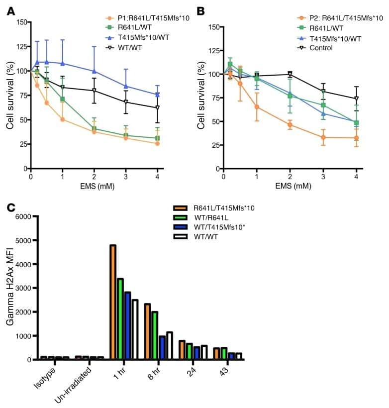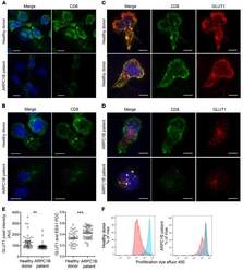 - Figure 7 Absence of ARPC1B alters surface expression of CD8 and GLUT1 in hCTLs. (A-D) HD and ARPC1B-deficient patient hCTLs were fixed in PFA for 20 minutes, permeabilized, and stained with an antibody against CD8 alone (green) ( A and B ) or in combination with anti-GLUT1 (red) and anti-EEA1 (white) antibodies ( C and D ). Images are 3D reconstructions of Z -stack. Scale bars: 4 mum. ( E ) Measurement of the mean intensity of GLUT1 expressed in AU and the degree of colocalization with EEA1 expressed as PCC (see Methods) in HD and ARPC1B-deficient patient hCTLs based on images as sampled in C and D . HD, n = 41 cells; ARPC1B-deficient patient, n = 38 cells. P < 0.005 (unpaired t test). ** P < 0.0013; *** P < 0.0002. ( F ) Flow cytometry analysis of the proliferation capacity of HD and ARPC1B-deficient patient hCTLs (gated on live CD8 + cells) in the absence (blue) or presence (red) of plate-bound anti-CD3 stimulation (1 mug/mL). All data are representative of 3 independent experiments.