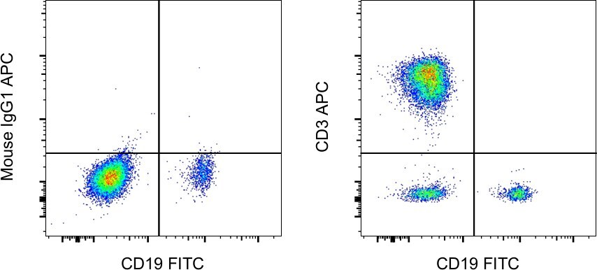 - Normal human peripheral blood cells were stained with CD19 Monoclonal Antibody, FITC (Product # 11-0199-42) and Mouse IgG1 kappa Isotype Control, APC (Product # 17-4714-82) (left) or CD3 Monoclonal Antibody, APC (right). Cells in the lymphocyte gate were used for analysis.
