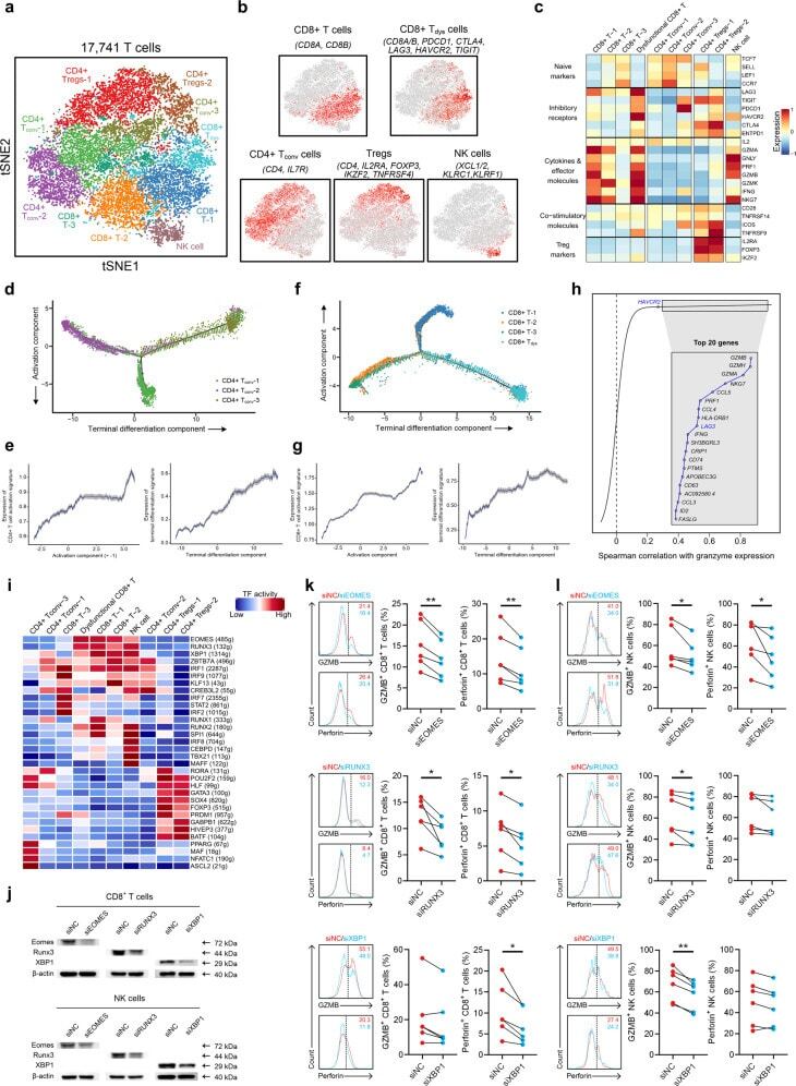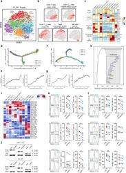 - Fig. 4 T/NK cell clusters in NPC. a t-SNE plot showing 10 clusters of 17,263 T/NK cells (indicated by colors). b t-SNE plot, color coding for the expression of the marker genes (gray to red) for the indicated cell subtypes. c Average expression of selected T cell function-associated genes of naive markers, inhibitory receptors, cytokines and effector molecules, co-stimulatory molecules, and Treg markers in each cell cluster. d Potential developmental trajectory of CD4 + T cells ( n = 5694) inferred by analysis with Monocle 2. Arrows show the increasing directions of certain CD4 + T cell properties annotated with the signatures shown in e . e Traceplots of (left) CD4 + T cell activation signature along activation component and (right) terminal differentiation signature along terminal differentiation component for the CD4 + T cells. Cells are projected along the component, with the blue line indicating the moving average of the expression of signatures (a sliding window of length equal to 5% of the total number of CD4 + T cells was used), and the shaded area displaying SEM. Signatures used are presented in Supplementary information, Table S9 . f Potential developmental trajectory of CD8 + T cells ( n = 6975) inferred by analysis with Monocle 2. Arrows show the increasing directions of certain CD8 + T cell properties annotated with the signatures shown in g . g Traceplots (as in e ) of (left) CD8 + T cell activation signature along activation component and (right) terminal diffe