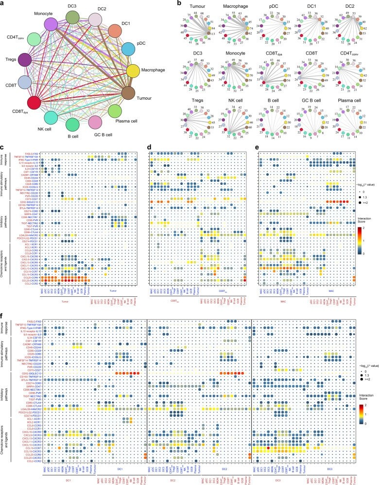 - Fig. 6 The dense network and multiple regulatory immune responses in the TME of NPC. a Capacity for intercellular communication between malignant cells and immune cells. Each line color indicates the ligands expressed by the cell population represented in the same color (labeled). The lines connect to the cell types that express the cognate receptors. The line thickness is proportional to the number of ligands when cognate receptors are present in the recipient cell type. The loops indicate autocrine circuits. The map quantifies potential communication but does not account for the anatomical locations or boundaries of the cell types. b Detailed view of the ligands expressed by each major cell type and the cells expressing the cognate receptors primed to receive the signal. Numbers indicate the quantity of ligand-receptor pairs for each intercellular link. c - f Overview of selected ligand-receptor interactions of tumor cells ( c ), dysfunctional CD8 + T cells ( d ), macrophages ( e ), and the three types of DCs ( f , DC1, DC2, and DC3). P values are indicated by circle size, with the scale to the right (permutation test). The means of the average expression levels of interacting molecule 1 in cluster 1 and interacting molecule 2 in cluster 2 are indicated by color. Assays were carried out at the mRNA level but were used to extrapolate protein interactions. CD4T conv , conventional CD4 + T cell; CD8T, CD8 + T cell; CD8T dys , dysfunctional CD8 + T cell; DC, dendritic cell; GCB