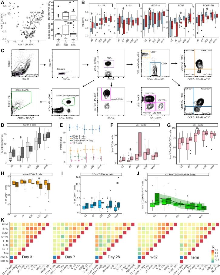 - Figure 2 T cell ontogenesis in extremely premature infants with and without severe brain injury (A) Principal coordinates analysis (PCoA)--biplot of sequestered cytokine and chemokine composition. Silhouette scoring identified 3 main cyto-Clusters (as indicated by different symbols). The shade of the symbols (gray to black) is determined by days post-delivery--the older the infant the darker the symbol. The size of the symbols is determined by the Kidokoro Score as assessed at term-equivalent age via cMRI--the higher the score the larger the symbol. Significantly correlated (p < 0.05) cytokines/chemokines are plotted as arrows. In addition, box plots next to PCoA show the range of combined values for burst suppression and variance of cranial oxygenation (BS/100 x VAR-cSO 2 ), as well as the range of Kidokoro Scores in the respective cyto-clusters (cyto-cluster 1, CC1; cyto-cluster 2, CC2; cyto-cluster 3, CC3). (B) Blood cytokine/chemokine concentrations in infants with (red) and without (blue) severe BI (3 days post-delivery, d3; 7 days post-delivery, d7; 28 days post-delivery, d28; 32 weeks of gestational age, w32; term-equivalent age = term). (C) Representative images illustrating the gating strategy for FACS analysis. Differently colored gates mark gating for respective cell populations. Magenta, untargeted; blue, T helper cells; orange, cytotoxic T cells; green, T regulatory cells; pink, gammadelta T cells. For box plots in (D) and (F-J), darker shade represents data from