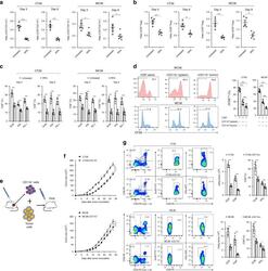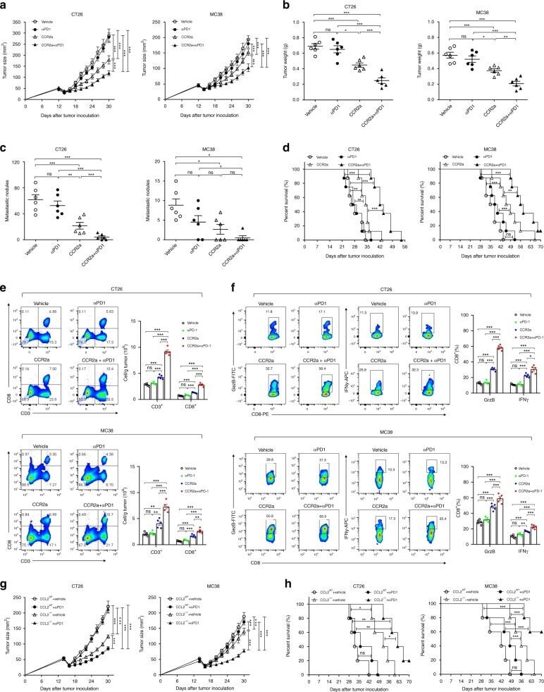 - Fig. 8 CCL2/CCR2 blockade inhibits tumor progression and overcomes resistance to anti-PD-1 therapy. a - f iRFA treatment was performed in CT26 and MC38 colon cancer models as shown in Fig. 2a . Anti-PD-1 mAb (200 mug, clone: J43) was administered through intraperitoneal injection to mice every 3 days for a total of four times. The CCR2 antagonist (CCR2a) (RS504393, Tocris) was given subcutaneously at a dose of 5 mg/kg twice per day for 9 days. a Growth curve of the CT26 and MC38 residual tumor (one-sided ANOVA test, n = 8). b The weight of the residual CT26 and MC38 tumor examined on day 14 after iRFA by dissection of the mice ( n = 6). c The number of metastases examined on day 14 after iRFA by dissection the mice ( n = 6). d Kaplan-Meier survival curves are shown, and the log-rank test was performed ( n = 8). e Flow cytometric analysis and quantification of CD3 + and CD8 + infiltration (gate on single live cells) in residual CT26 tumors. f Granzyme B and IFNgamma expression on CD8 + cells in residual CT26 tumors. (gate on CD8 + cells) ( n = 5). g , h iRFA treatment was performed in mice bearing wild type and CCL2 -/- CT26 or MC38 tumor. g Growth curve of the CT26 and MC38 residual tumor (one-sided ANOVA test, n = 5). h Kaplan-Meier survival curves are shown, and the log-rank test was performed ( n = 8). Data represent results from 1/2 independent experiments. The data are represented as mean +- SEM. Statistical differences between pairs o