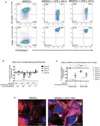 - Figure 5 CD169, as an HIV-1 receptor, mostly impacts transfer from mature MDDCs rather than immature MDDCs. (A) Flow cytometry plots showing CD86, DC-SIGN, and CD169 expression levels on MDDCs (pre-gated on SSC FSC, living cells, CD3 - cells and singlets). Panels show the expression of these proteins in iMDDCs (left panel) and MDDCs with LPS pretreatment at 100 ng/ml for 48 or 24 h before co-culture (middle and right panels, respectively). (B) Percentage of variation of HIV-1 transfer when using iMDDCs or LPS-treated MDDCs (100 ng/ml LPS for different lengths of time) incubated with a blocking antibody against CD169 as compared to an isotype control for each condition. Results are displayed for 4 different blood donors with the mean +- SD of technical triplicates. (C) Percent of variation in HIV-1 transfer to assess the impact of blocking CD169 and TSPAN7 knockdown as compared to scramble shRNA on MDDCs matured with LPS for 48 h treated by an isotype control. Mean +- SD of seven different blood donors in 4 experiments. (B,C) NS, not significant. ** p < 0.01; *** p < 0.001. (D) Confocal microscopy images of iMDDCs (left panel) and mature MDDCs (mMDDCs) right panel, to assess the degree of colocalization between CD169 (magenta) and incoming X4-HIV-1-Gag-iGFP (green). Actin filaments and nuclei were stained with phalloidin (red) and DAPI (blue). Four hundred nanometers of Z-stacks were taken 40 h after the start of the co-culture with CD4 + T cells and X4-HIV-1-Gag-iGFP. The pic