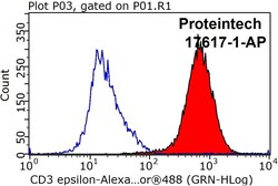 - 1X10^6 Jurkat cells were stained with 0.5ug CD3 antibody (17617-1-AP, red) and control antibody (blue). Fixed with 90% MeOH blocked with 3% BSA (30 min). Alexa Fluor 488-conjugated AffiniPure Goat Anti-Rabbit IGG (H+L) with dilution 1:1000.