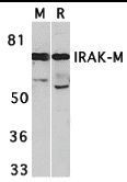 - Western blot analysis of IRAK-M in (M) mouse spleen and (R) rat liver tissue lysates with IRAK-M antibody at 1 μg/mL.