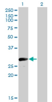- Western Blot: VGLL1 Antibody (3C7) [H00051442-M01] - Analysis of VGLL1 expression in transfected 293T cell line by VGLL1 monoclonal antibody (M01), clone 3C7.Lane 1: VGLL1 transfected lysate(28.7 KDa).Lane 2: Non-transfected lysate.