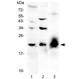 - Western blot testing of 1) human placenta, 2) rat thymus and 3) mouse thymus tissue lysate with IL22 antibody. Expected molecular weight: 19~25 kDa depending on glycosylation level.