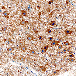 - Acetylcholinesterase/ACHE in Human Brain. Acetylcholinesterase/ACHE was detected in immersion fixed paraffin-embedded sections of human brain (substantia nigra) using Sheep Anti-Human Acetylcholinesterase/ACHE Antigen Affinity-purified Polyclonal Antibody (Catalog # AF7574) at 3 µg/mL overnight at 4 °C. Tissue was stained using the Anti-Sheep HRP-DAB Cell & Tissue Staining Kit (brown; Catalog # CTS019) and counterstained with hematoxylin (blue). Specific staining was localized to cytoplasm in neurons. View our protocol for Chromogenic IHC Staining of Paraffin-embedded Tissue Sections.