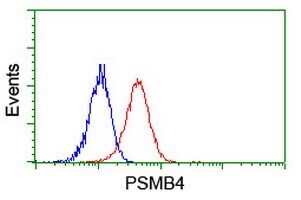 - Flow cytometric analysis of Jurkat cells, using anti-PSMB4 antibody (TA504090), (Red), compared to a nonspecific negative control antibody, (Blue).