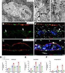 - Figure 12 DSS colitis is associated with macrophage-dependent structural and functional disruption of the BMB. Electron microscopy of DSS-treated colon ( A ) reveals partial disruption ( A', arrows ) or complete absence ( A"", arrows ) of periganglionic basement membrane. PGS is dense and closely packed with collagen fibers ( A'-A"", double arrows ). 60 minutes after administration of FITC-dextran to DSS-treated animals leads to FITC accumulation in the enteric ganglia ( B-B' ) and MyMs ( B', arrowhead ). Clodronate treatment prevents this, leaving FITC-dextran particles accumulating in the PGS surrounding the ganglia ( C-C' ). D , E , and F show the change in mean fluorescent intensity 10, 45, and 60 minutes after FITC-dextran injections in whole gut ( D ), muscularis ( E ), and enteric ganglia ( F ).