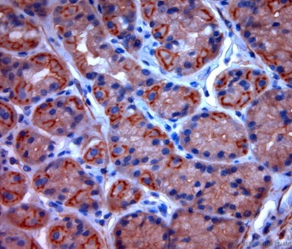 - Rabbit antibody to TPC2 (700-752). IHC-P on paraffin sections of human stomach. HIER: Tris-EDTA, pH 9 for 20 min using Thermo PT Module. Blocking: 0.2% LFDM in TBST filtered through a 0.2 micron filter. Detection was done using Novolink HRP polymer from Leica following manufacturers instructions. Primary antibody: dilution 10 ug/ml, incubated 30 min at RT using Autostainer. Sections were counterstained with Harris Hematoxylin.