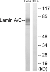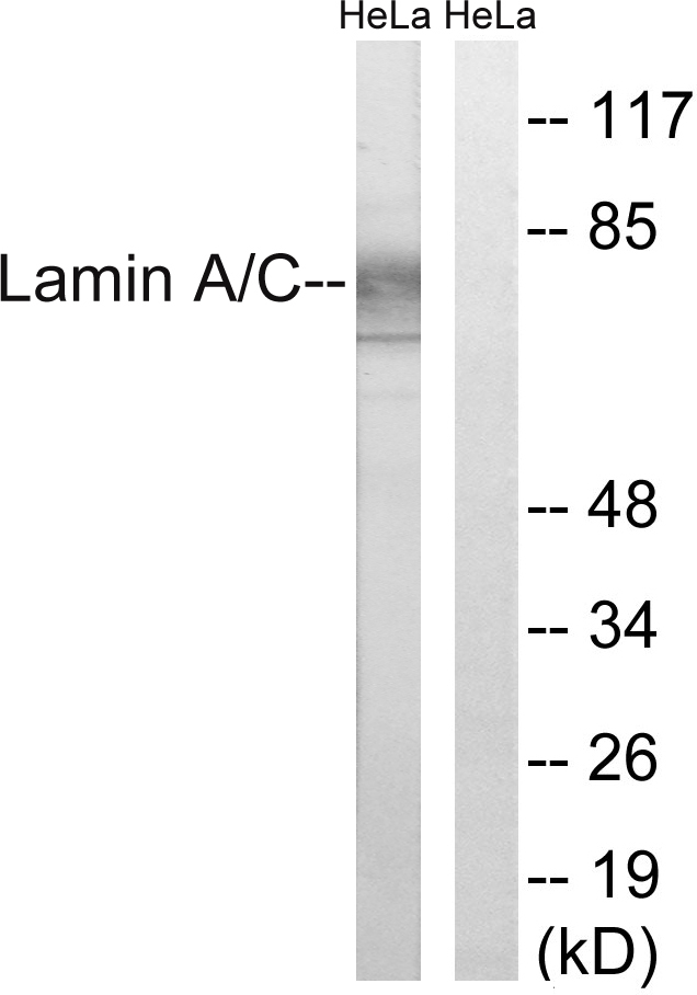 - Western blot analysis of lysates from HeLa cells, treated with paclitaxel 1uM 24h, using Lamin A Antibody. The lane on the right is blocked with the synthesized peptide.