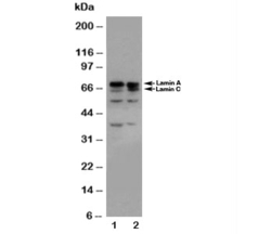- Western blot testing of Lamin A/C antibody and Lane 1: HeLa; 2: A431 cell lysate