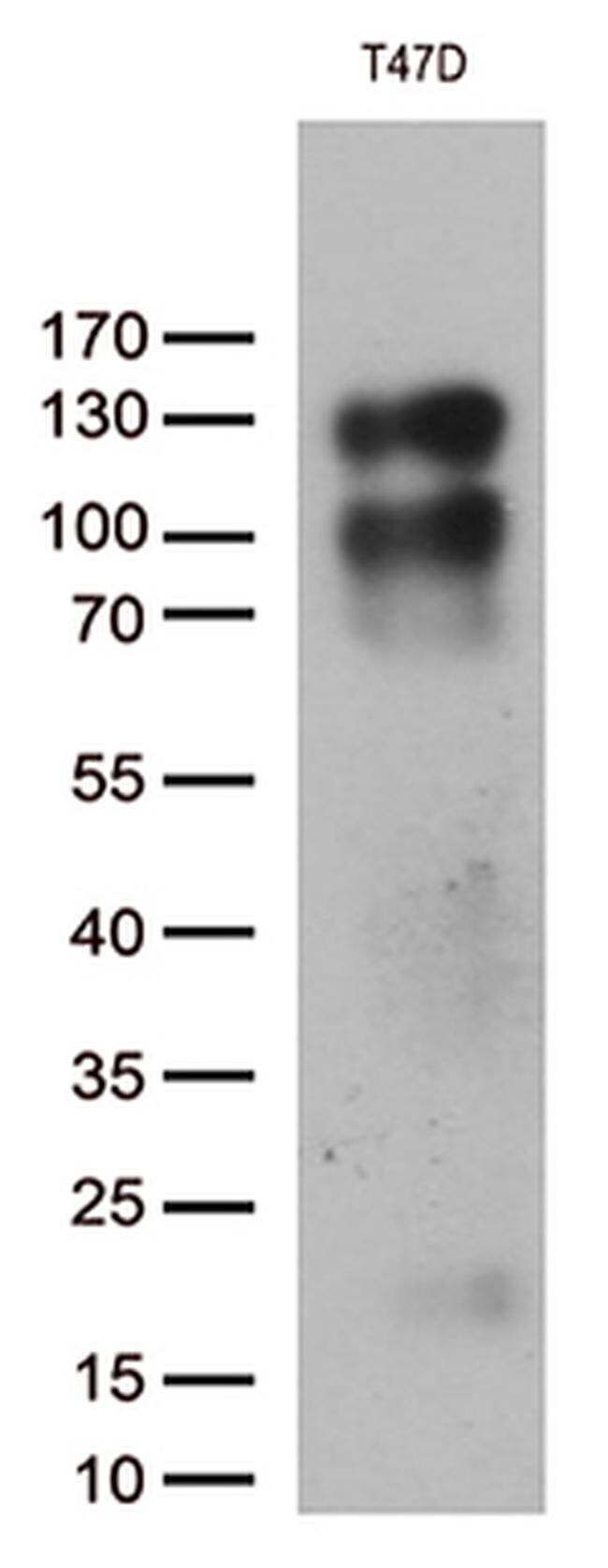 - Western blot analysis of extracts (35 µg) from T47D cells by using anti-PGR monoclonal antibody. (1:500)