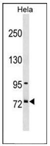 - Western blot analysis using SF4 Antibody (Center) in Hela cell line lysates (35ug/lane). This demonstrates the SF4 antibody detected the SF4 protein (arrow).