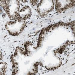 - Immunohistochemical staining of human prostate shows strong nuclear positivity in glandular cells.