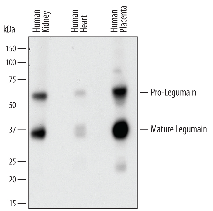 - Detection of Human Legumain/ Asparaginyl Endopeptidase by Western Blot. Western blot shows lysates of human kidney tissue, human heart tissue, and human placenta tissue. PVDF membrane was probed with 1 µg/mL of Goat Anti-Human Legumain/Asparaginyl Endopeptidase Antigen Affinity-purified Polyclonal Antibody (Catalog # AF2199) followed by HRP-conjugated Anti-Goat IgG Secondary Antibody (Catalog # HAF109). Specific bands were detected for Pro-Legumain/ Asparaginyl Endopeptidase at approximately 56 kDa and mature Legumain/Asparaginyl Endopeptidase 37 kDa (as indicated). This experiment was conducted under reducing conditions and using Immunoblot Buffer Group 1.