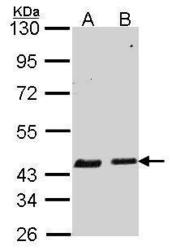 - Sample (30 ug of whole cell lysate) A: A549 B: Hela 10% SDS PAGE GTX114637 diluted at 1:1000
