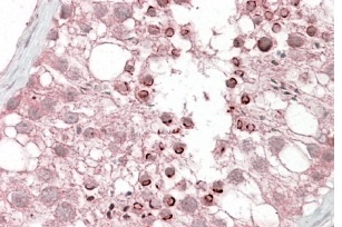 - OAEB00679 (3.8µg/ml) staining of paraffin embedded Human Testis. Steamed antigen retrieval with citrate buffer pH 6, AP-staining.