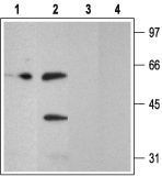 - WB analysis of rat brain (lanes 1 and 3) and lung (lanes 2 and 4) membranes using P2Y2 antibody at a dilution of 1:200 in the absence (lens 1 and 2) or presence (lens 3 and 4) of blocking peptide.