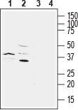 - Western blot analysis of mouse BV-2 microglia cell line lysate (lanes 1 and 3) and rat brain membranes (lanes 2 and 4): - 1,2. Anti-P2Y6 Receptor (extracellular) Antibody (#APR-106), (1:200).3,4. Anti-P2Y6 Receptor (extracellular) Antibody , preincubated with P2Y6 Receptor (extracellular) Blocking Peptide (#BLP-PR106).