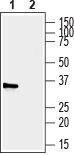 - Western blot analysis of human MDA-MB-231 breast adenocarcinoma cell line lysate: - 1. Anti-P2Y6 Receptor (extracellular) Antibody (#APR-106), (1:200). 2. Anti-P2Y6 Receptor (extracellular) Antibody , preincubated with P2Y6 Receptor (extracellular) Blocking Peptide (#BLP-PR106).