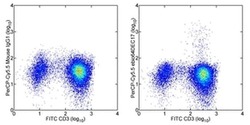 - Intracellular staining of normal human peripheral blood cells stimulated with PMA/Ionomycin for 5 hours in the presence of Monensin with Anti-Human CD3 FITC (Product # 11-0039-42) and Mouse IgG1 K Isotype Control PerCP-Cyanine5-5 (Product # 45-4714-82) (left) or Anti-Human IL-17A PerCP-Cyanine5-5 (right). Cells in the lymphocyte gate were used for analysis.