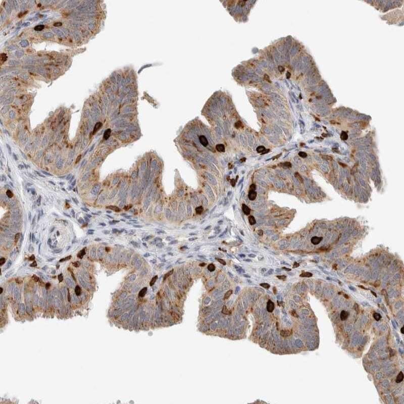- Immunohistochemical analysis of RUNDC1 in human fallopian tube using RUNDC1 Polyclonal Antibody (Product # PA5-54874) shows strong cytoplasmic positivity in a subset of glandular cells.