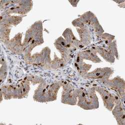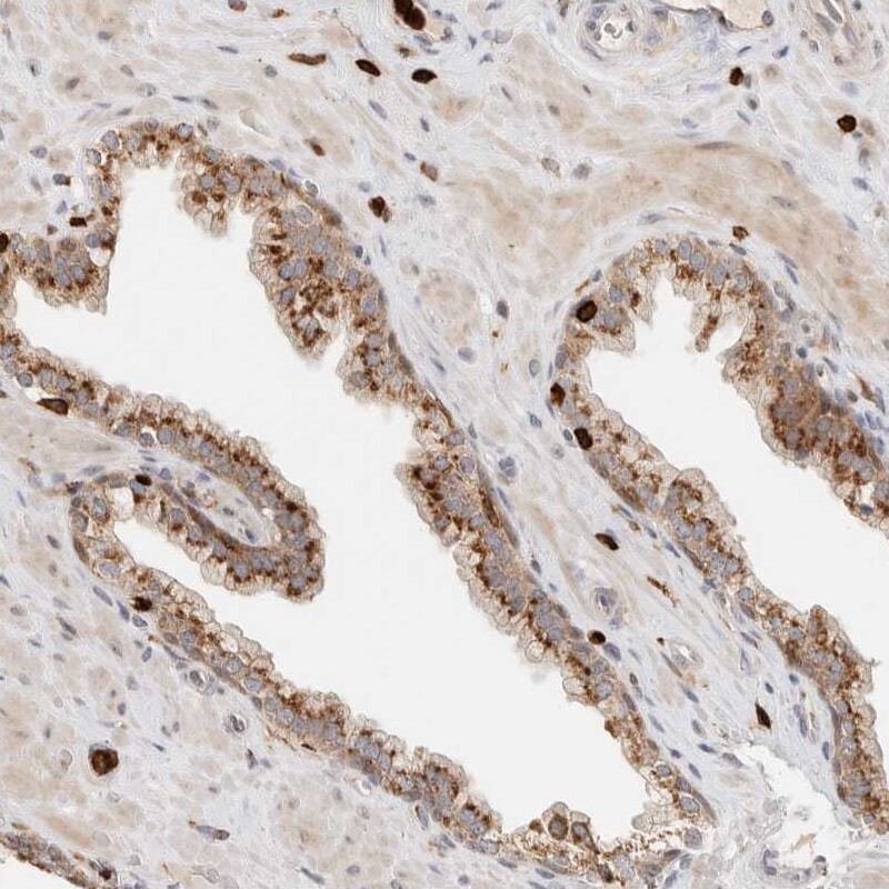 - Immunohistochemical analysis of RUNDC1 in human prostate using RUNDC1 Polyclonal Antibody (Product # PA5-54874) shows strong cytoplasmic positivity in glandular cells.