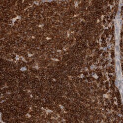 - Immunohistochemical analysis of RUNDC1 in human lymph node using RUNDC1 Polyclonal Antibody (Product # PA5-54874) shows strong cytoplasmic positivity in lymphoid cells.