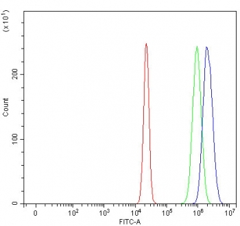 - Flow cytometry testing of human U-2 OS cells with RUNDC1 antibody at 1ug/million cells (blocked with goat sera); Red=cells alone, Green=isotype control, Blue= RUNDC1 antibody.