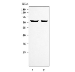 - Western blot testing of 1) human 293T and 2) monkey COS-7 cell lysate with RUNDC1 antibody. Predicted molecular weight ~68 kDa.