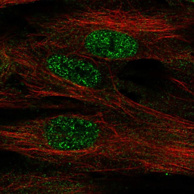 - Immunofluorescent staining of human cell line BJ shows localization to nucleoplasm.