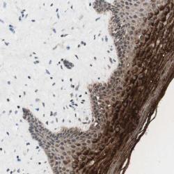 - Immunohistochemical staining of human vagina shows strong cytoplasmic positivity in squamous epithelial cells.