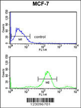 - RUVBL1 Antibody (Cat. #AP1922e) flow cytometry analysis of MCF-7 cells (bottom histogram) compared to a negative control cell (top histogram).FITC-conjugated goat-anti-rabbit secondary antibodies were used for the analysis.