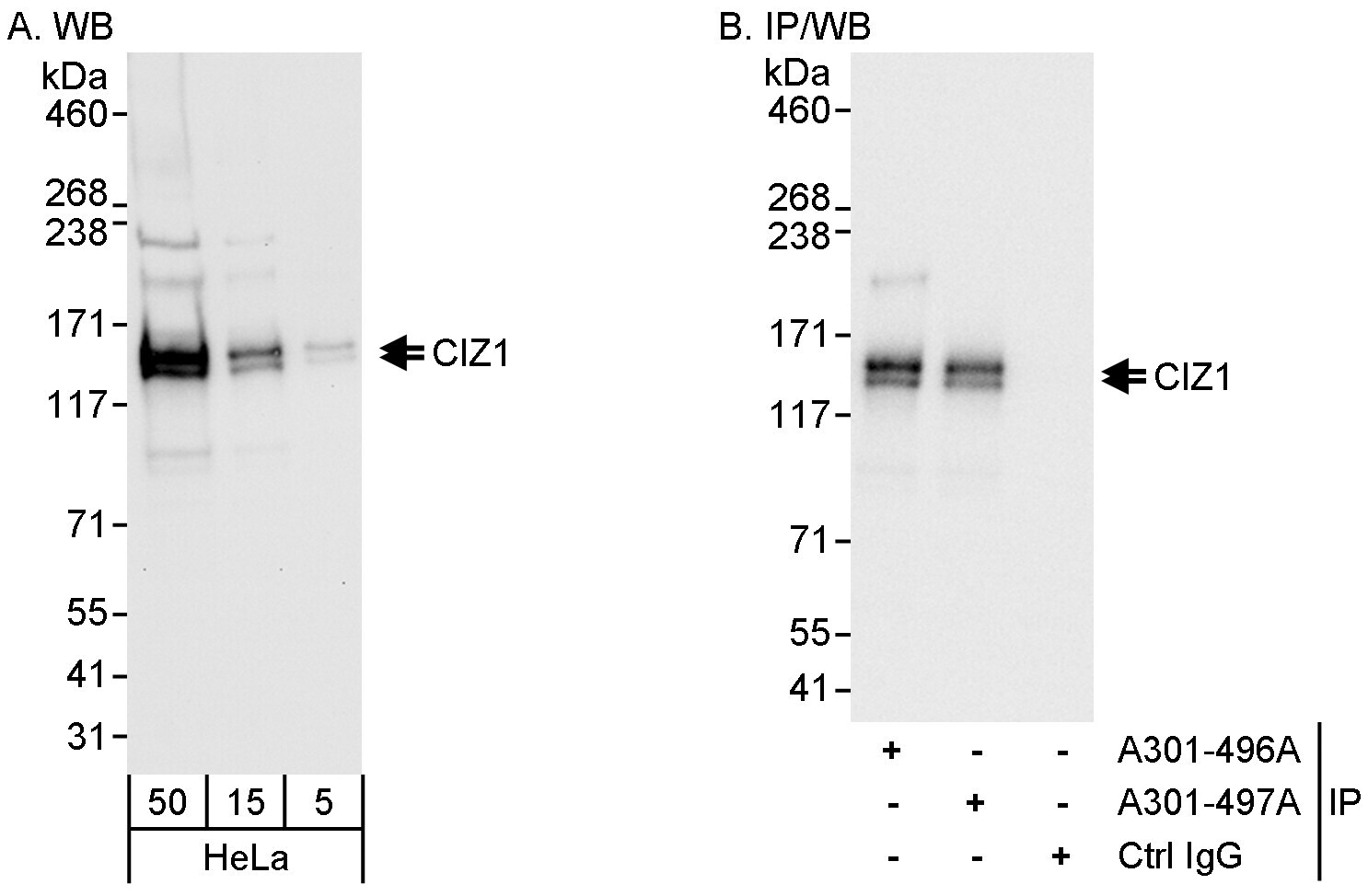 - Detection of human CIZ1 by western blot and immunoprecipitation. Samples: Whole cell lysate (5, 15 and 50 µg for WB; 1 mg for IP, 20% of IP loaded) from HeLa cells. Antibodies: Affinity purified rabbit anti-CIZ1 antibody A301-496A used for WB at 0.04 µg/ml (A) and 1 µg/ml (B) and used for IP at 3 µg/mg lysate. CIZ1 was also immunoprecipitated by rabbit anti-CIZ1 antibody A301-497A, which recognizes a downstream epitope. Detection: Chemiluminescence with exposure times of 30 seconds (A) and 1 second (B).