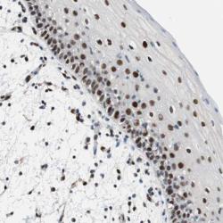 - Immunohistochemical staining of human oral mucosa shows distinct nuclear positivity in squamous epithelial cells.