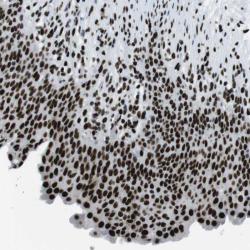 - Immunohistochemical staining of human urinary bladder shows strong nuclear positivity in urothelial cells.