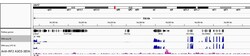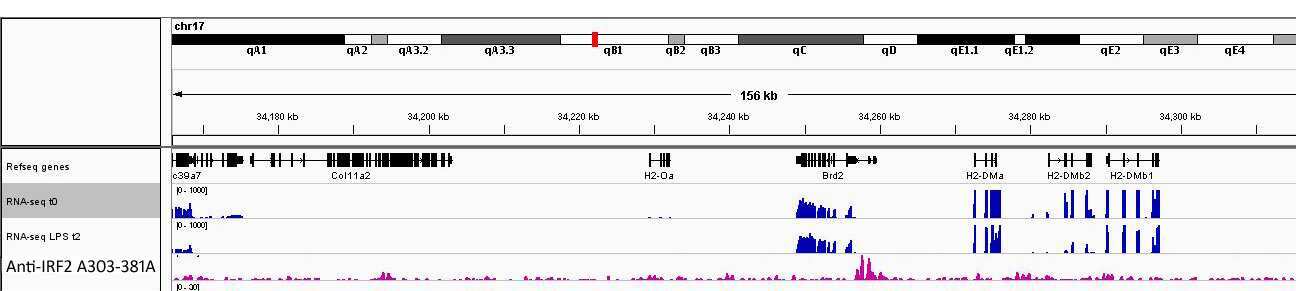 - Localization of IRF2 binding sites by ChIP-Sequencing. Chromatin from mouse bone marrow dendritic cells (BMDCs) was immunoprecipitated with anti-IRF2 A303-381A (lot A303-381A-1) and analyzed by DNA sequencing according to methods available at http://www.weizmann.ac.il/immunology/AmitLab/data-and-method/iChIP/method. The figure illustrates the peak distribution of IRF2 binding within a 156 kb region of chromosome 17 (pink) as detected by anti-IRF2 A303-381A.